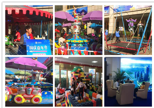 时逢国庆黄金周七天假日,秋高气爽,天气晴好。不少家长带着孩子来到中道广场营销中心,踊跃参与各种精彩有趣的游戏活动。有益智的积木乐园、刺激的蹦蹦床、惊险的打击怪兽、趣味的欢乐淘气堡、梦幻的旋转木马,孩子们玩得格外高兴、欢喜。玩累了,还可以坐在舒适的沙发上,边休息边品尝组织者精心准备的水果、蛋糕等小食品。这里有玩、有乐、有美味,收到了孩子们开心快乐、家长们舒心满意的预期效果。