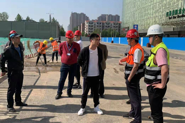 公司总经理李宪锋(右三)与项目负责人、中道房地产副总经理李永(右四)在施工现场检查指导工作。
