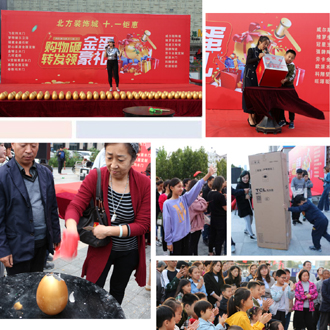 7日下午,中道南广场成了欢乐的海洋,大型红色拱门矗立在广场中央,“北方装饰城”巨大的标牌格外醒目。临时搭建的舞台上,节目主持人妙语连珠,暖场的演员纵情歌唱、舞蹈,魔术师戏法变化莫测,妙趣横生,精彩的表演赢得了台下观众的阵阵掌声和欢呼声,整个现场喜庆氛围热烈、浓厚。舞台背景“北方装饰城十一钜惠购物砸金蛋 微信转发领礼品”的巨幅广告引人注目。舞台前方摆放的金蛋更是人们用情关注的焦点。