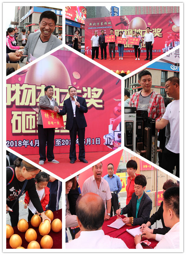5月1日开奖当天下午,短时的小阵雨给人们带来一种清新惬意的感觉。手持奖券的客户们早早从四面八方来到开奖现场。5时整,开奖正式开始。一个个获奖客户挑选好金蛋,手起捶落,金花四射,收获了自己心仪的奖品,内心的激动无以言表。所有的奖品名花有主,获奖者的脸上绽开了幸福甜蜜的笑容。至此,新北方装饰城又一次见证了“心怀感恩,诚信服务”的爱心感动,他们决心永远把优质环保商品和服务,奉献给每一位市场顾客!