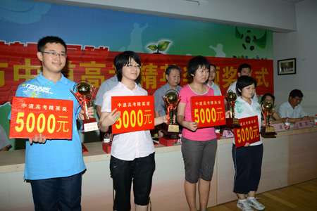 中道董事长王孟堂、邯郸市第一中学副校长肖波与获奖学子合影
